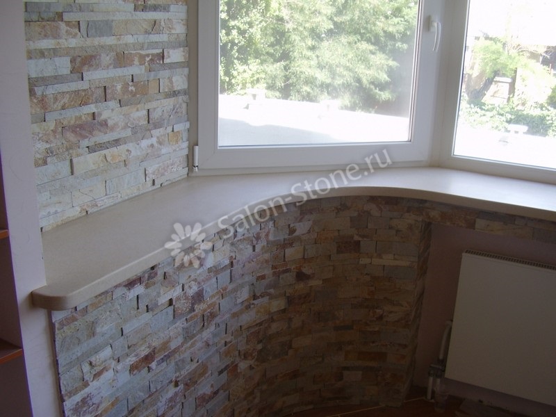 Полукруглый подоконник светлого оттенка из кварцевого агломерата